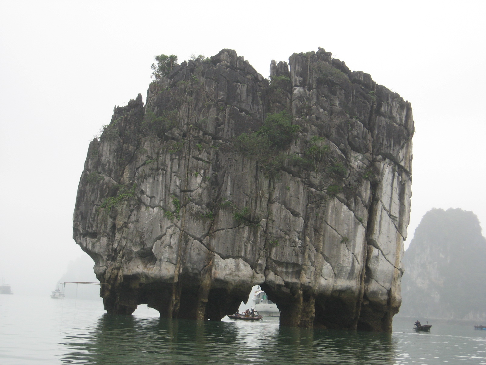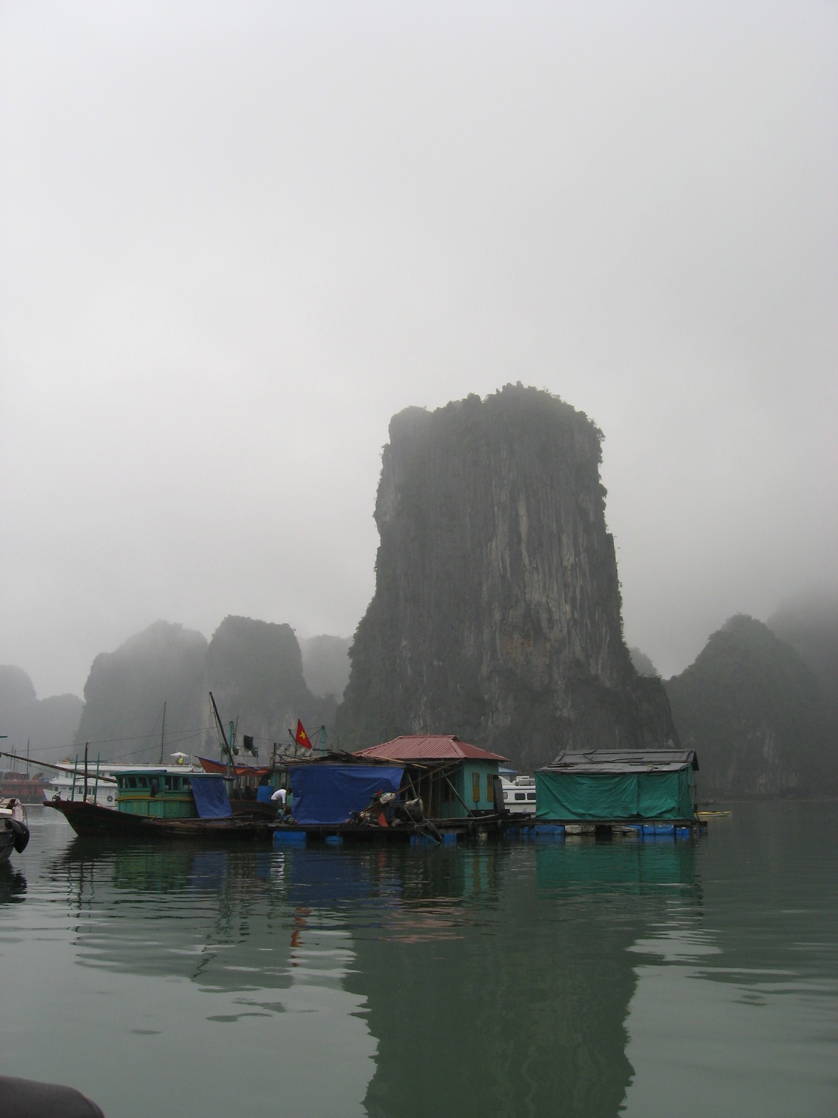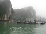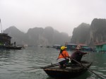We sailed out to Halong Bay, mist shrouding overhead.  It was also very cold. The rock formations or I called little mountains rose majestically from the water for us to get peeks as it was not a clear day.  We stopped at a small fishing village, docked and took a little tiny dinghy for sightseeing.