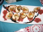 OK, I am finally getting around to remembering to post the recipes.  We had wasabi peas and mixed nuts with the tiny dried fish to wake up our palates. Dinner began with the usual ritual:  champagne.  We started with the 1990 Taittinger Collection which was still vibrant.  We followed that with the Rene Collard Ultime which is a very dry champagne but paired well with the food.  Then the Veuve Cliquot 1985 Rose, still holding well.  Concurrently opened the 2010 Rochioli Sauvingnon Blanc.  Gang was not into drinking champagne and sake that evening so we only opened the Kirin-Zan Kirin Mountain Junmai Dai-Ginjo sake.  This is ultra smooth, silky and went well wit the menu!  You can buy this at True Sake in San Francisco.  They have fantastic inventory and the people are very nice.  Gang preferred to quench with reds so we went through a 2004 Rochioli West Block, 1995 Chateau Montelena Estate cabernet, and a 2004 Parry Cellars. Our menu was garlic shrimp crostini, mango-avocado salad, miso skirt steak, stuffed, boneless drumstick, grilled asparagus with roasted sesame dressing, Nobu miso style salmon, Filipino style bbq pork skewers, yam and shitake mushroom rice, chocolate bouchon, lemon tart and matcha tea cake. See recipes tab.