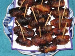 Variations: You can also stuff the dates with blue cheese and wrap with bacon and bake at 425° for 15 mins. You can also stuff the dates with blue cheese and a slice of pickled jalapeño pepper, wrap with prosciutto, jam on and bake 350° in oven for a few minutes till warm. Another variation is to stuff the date with dark chocolate and bake in the oven till warm, or wrap a bacon around the date and bake at 425° till crisp. Use your imagination to come up with your own variation.